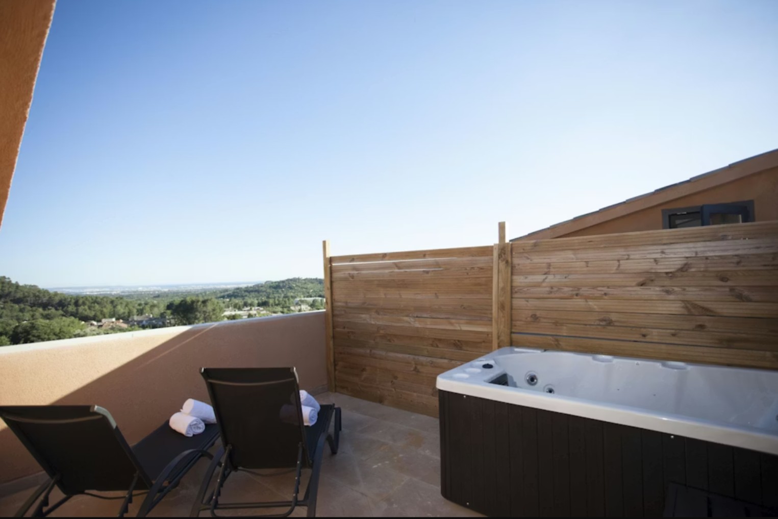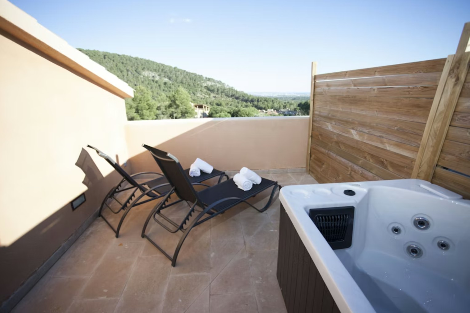Each room has its own unique style and features the charm of a private upper terrace with a jacuzzi, offering spectacular views of the garden and the mountains. The terrace is furnished with sun loungers for your comfort. All our jacuzzis use natural water, which is not heated and always remains at ambient temperature. The jacuzzi is outdoors, so it is only available during the spring and summer months. This room type includes a shower in the bathroom.